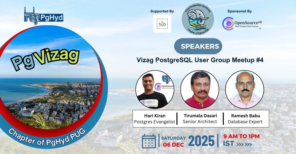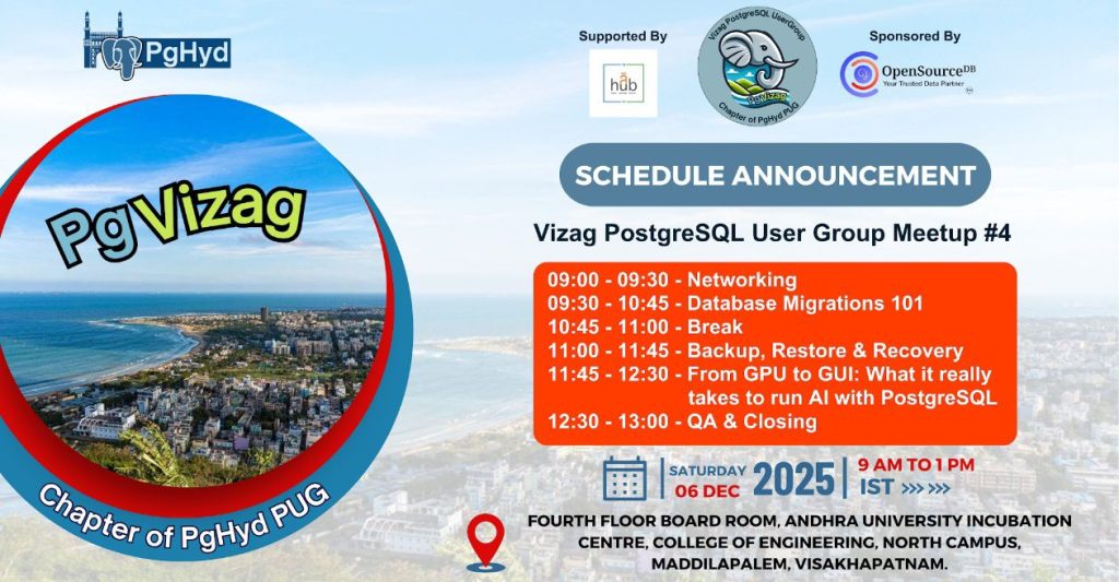 Big thanks to our speakers, to OpenSourceDB for proudly sponsoring the event, and to Andhra University Incubation Center for supporting us with the venue.